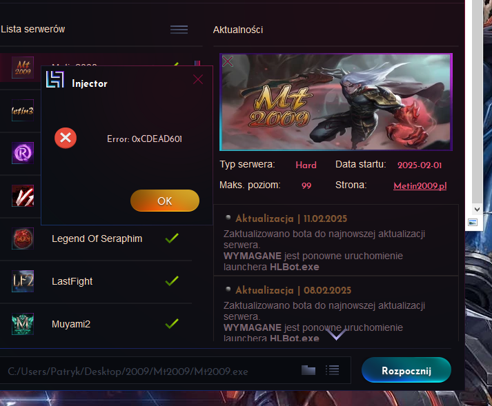 Czego dotyczy problem: Bot nie uruchamia sie Serwer Metin2009